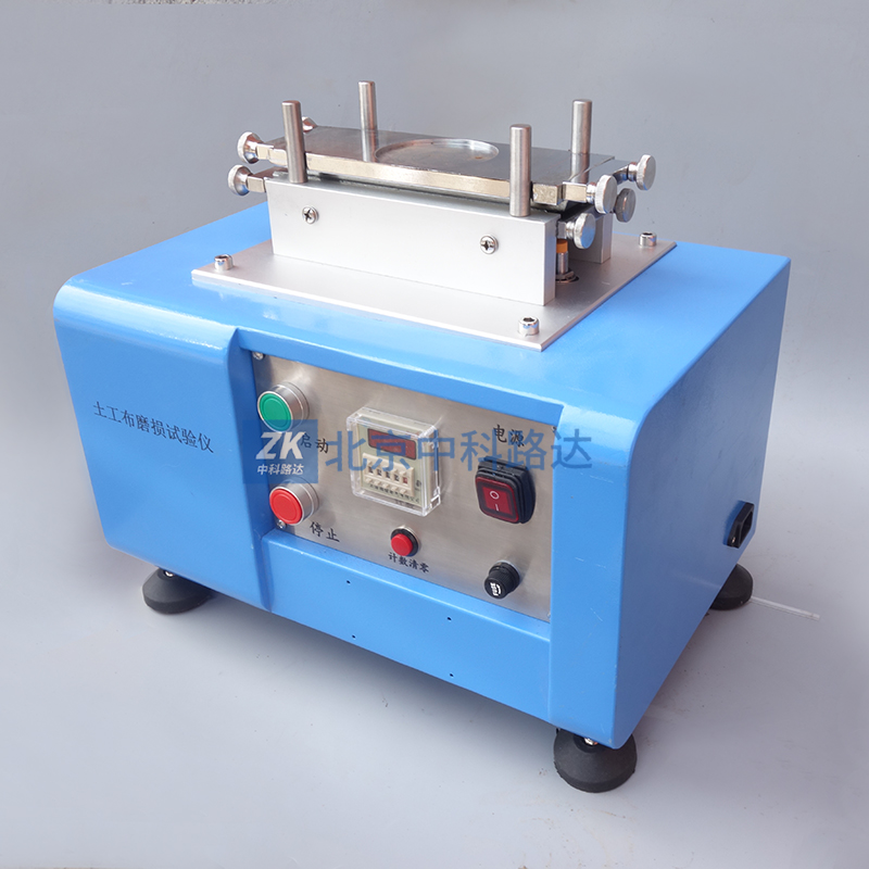 本儀器用于測定機織土工布、非織造土工布及其相關產品的抗磨損性能。將試樣固定在平臺上,在規定壓力與摩擦動作的條件下,使具有規定表面特性的磨料與之摩擦,最后測試試樣摩擦前后拉伸強力,以強力損失的百分率來描述試樣的耐磨損性能。