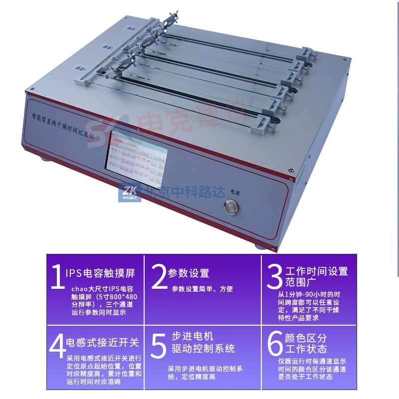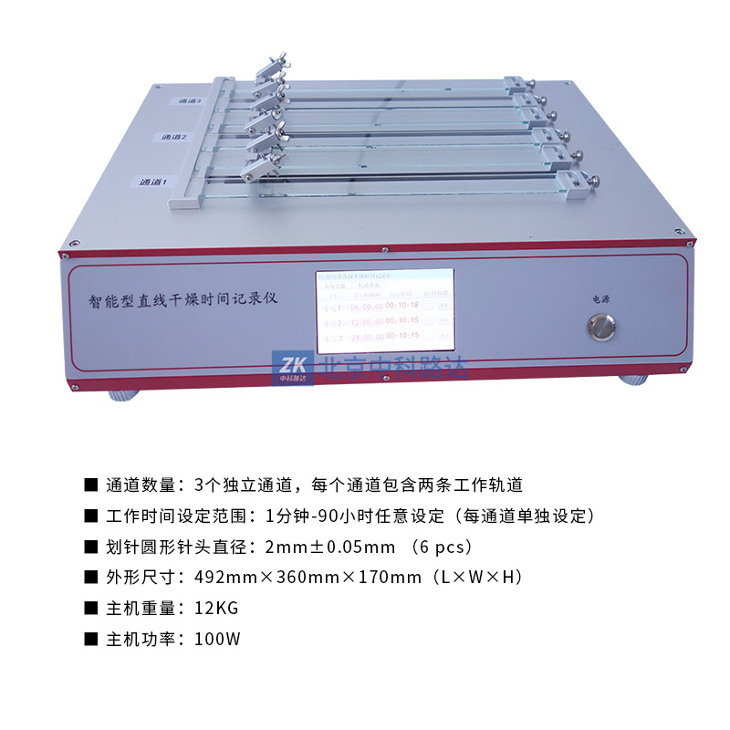 這是一款功能強大的智能型的直線干燥時間記錄儀,可以滿足不同干燥時間特性的樣品的全面分析。帶半球型觸點的劃桿安裝在滑架上。劃桿由滑架帶動,與新涂膜層接觸,由一端開始,在試樣上作縱向移動。可通過儀器的“軌跡查詢”功能查看對應(yīng)軌跡的各個干燥階段。它有三個可以單獨設(shè)定任意運行時間的通道(每個通道有兩條工作軌道),符合ASTM D 5895的標準要求。