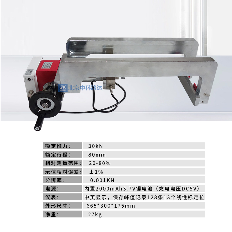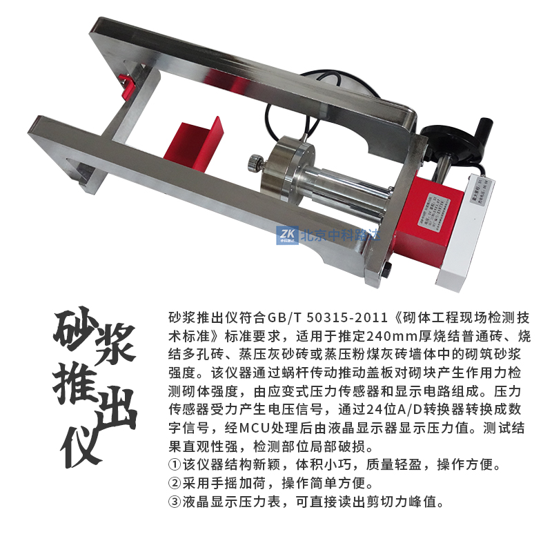 砂漿推出儀符合GB/T 50315-2011《砌體工程現場檢測技術標準》標準要求,適用于推定240mm厚燒結普通磚、燒結多孔磚、蒸壓灰砂磚或蒸壓粉煤灰磚墻體中的砌筑砂漿強度。該儀器通過蝸桿傳動推動蓋板對砌塊產生作用力檢測砌體強度,由應變式壓力傳感器和顯示電路組成。壓力傳感器受力產生電壓信號,通過24位A/D轉換器轉換成數字信號,經MCU處理后由液晶顯示器顯示壓力值。測試結果直觀性強,檢測部位局部破損。
