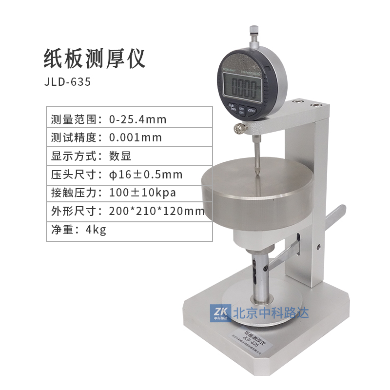 產品簡介本測厚儀用于紙和紙板厚度的測定, 適用于各種單層或多層的紙和紙板,但不適用于瓦楞紙板。在規定的靜態負荷下,根據試驗要求測量出單張紙頁或一疊紙頁的厚度,分別以單層厚度或層積厚度來表示結果。符合GB/T 451.3-2002《紙和紙板厚度的測定》的標準要求。一、主要技術參數1、測量范圍:0-25.4mm2、測試精度:0.001mm3、顯示方式:數顯4、壓頭尺寸:φ160.5mm5、接觸壓力:1...