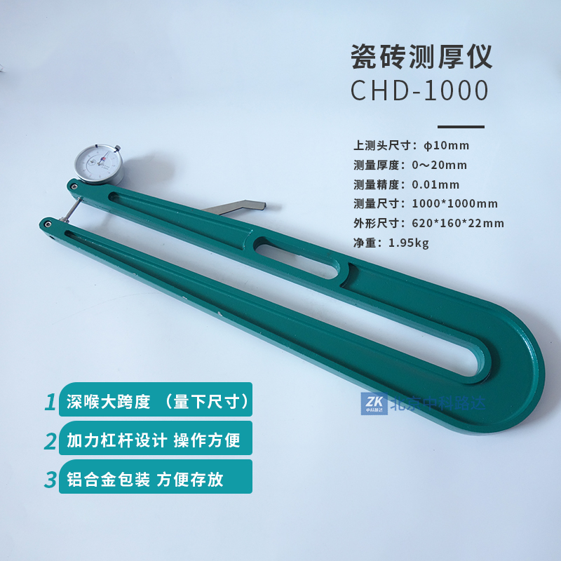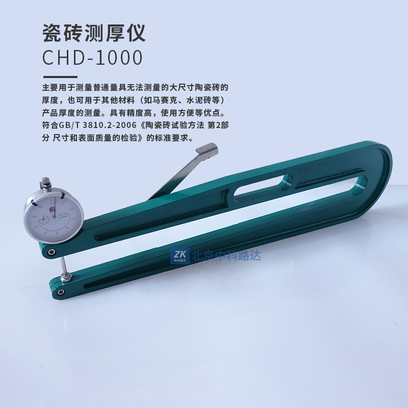 主要用于測量普通量具無法測量的大尺寸陶瓷磚的厚度,也可用于其他材料(如馬賽克、水泥磚等)產品厚度的測量。具有精度高,使用方便等優點。符合GB/T 3810.2-2006《陶瓷磚試驗方法 第2部分 尺寸和表面質量的檢驗》的標準要求。