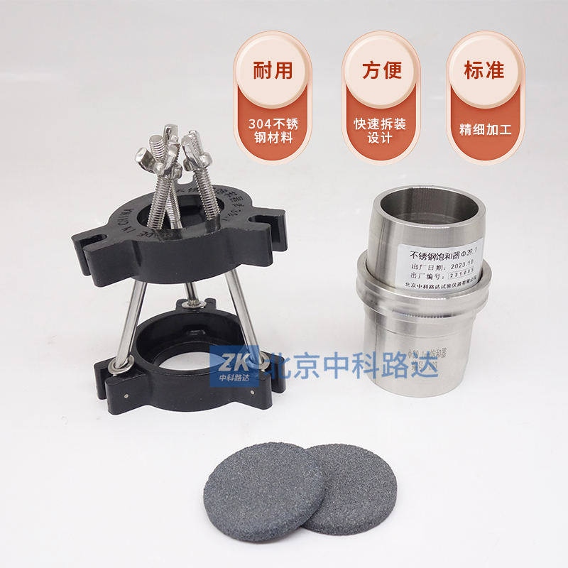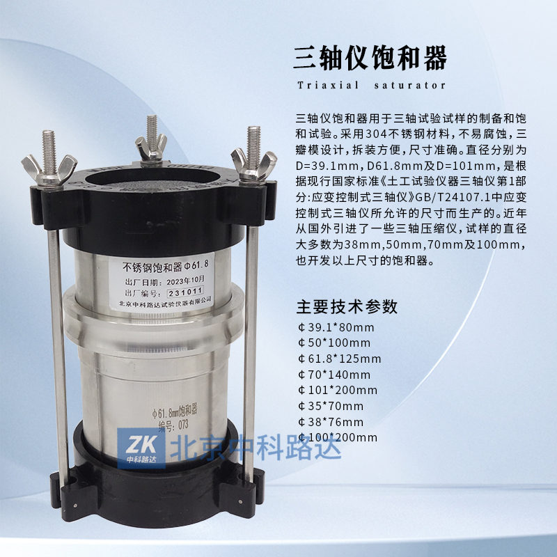 三軸儀飽和器用于三軸試驗試樣的制備和飽和試驗。采用304不銹鋼材料,不易腐蝕,三瓣模設計,拆裝方便,尺寸準確。直徑分別為D=39.1mm,D61.8mm及D=101mm,是根據現行國家標準《土工試驗儀器三軸儀第1部分:應變控制式三軸儀》GB/T24107.1中應變控制式三軸儀所允許的尺寸而生產的。近年從國外引進了一些三軸壓縮儀,試樣的直徑大多數為38mm,50mm,70mm及100mm,也開了發以上尺寸的飽和器。