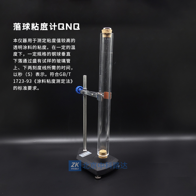 本儀器用于測定粘度值較高的透明涂料的粘度。在一定的溫度下,一定規格的鋼球垂直下落通過盛有試樣的玻璃管上、下兩刻度線所需的時間,以秒(S)表示。符合GB/T 1723-93《涂料粘度測定法》的標準要求。