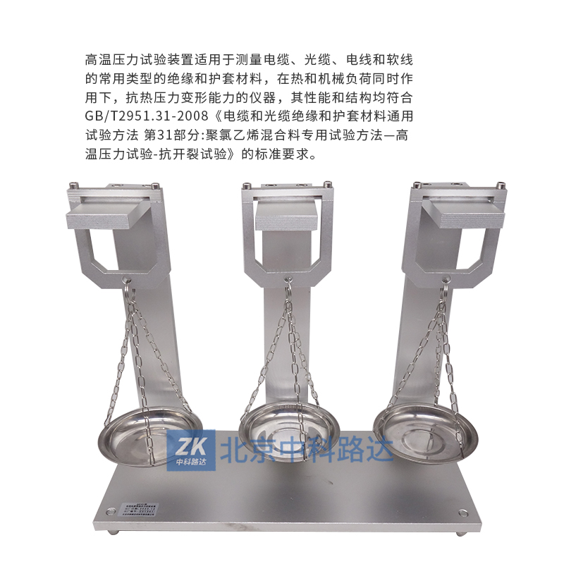 高溫壓力試驗(yàn)裝置適用于測量電纜、光纜、電線和軟線的常用類型的絕緣和護(hù)套材料,在熱和機(jī)械負(fù)荷同時作用下,抗熱壓力變形能力的儀器,其性能和結(jié)構(gòu)均符合GB/T2951.31-2008《電纜和光纜絕緣和護(hù)套材料通用試驗(yàn)方法 第31部分:聚氯乙烯混合料專用試驗(yàn)方法—高溫壓力試驗(yàn)-抗開裂試驗(yàn)》的標(biāo)準(zhǔn)要求。