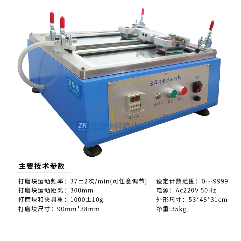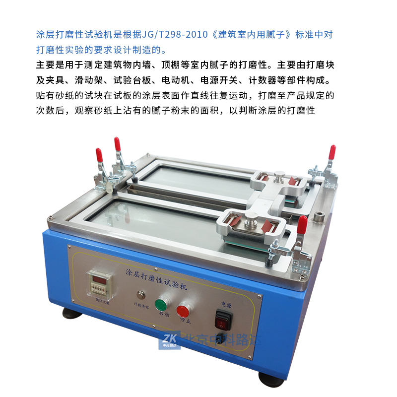 涂層打磨性試驗機是根據JG/T298-2010《建筑室內用膩子》標準中對打磨性實驗的要求設計制造的。主要是用于測定建筑物內墻、頂棚等室內膩子的打磨性。主要由打磨塊及夾具、滑動架、試驗臺板、電動機、電源開關、計數器等部件構成。貼有砂紙的試塊在試板的涂層表面作直線往復運動,打磨至產品規定的次數后,觀察砂紙上沾有的膩子粉末的面積,以判斷涂層的打磨性。