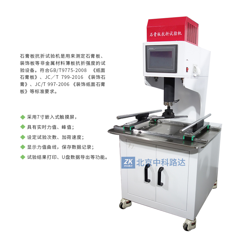 石膏板抗折試驗機是用來測定石膏板、裝飾板等非金屬材料薄板抗折強度的試驗設備。符合GB/T9775-2008 《紙面石膏板》、JC∕T 799-2016 《裝飾石膏》、JC/T 997-2006 《裝飾紙面石膏板》等標準要求。采用7寸嵌入式觸摸屏,具有實時力值、峰值;設定試驗次數、加荷速度;顯示力值曲線,保存數據記錄; 試驗結果打印、U盤數據導出等功能。