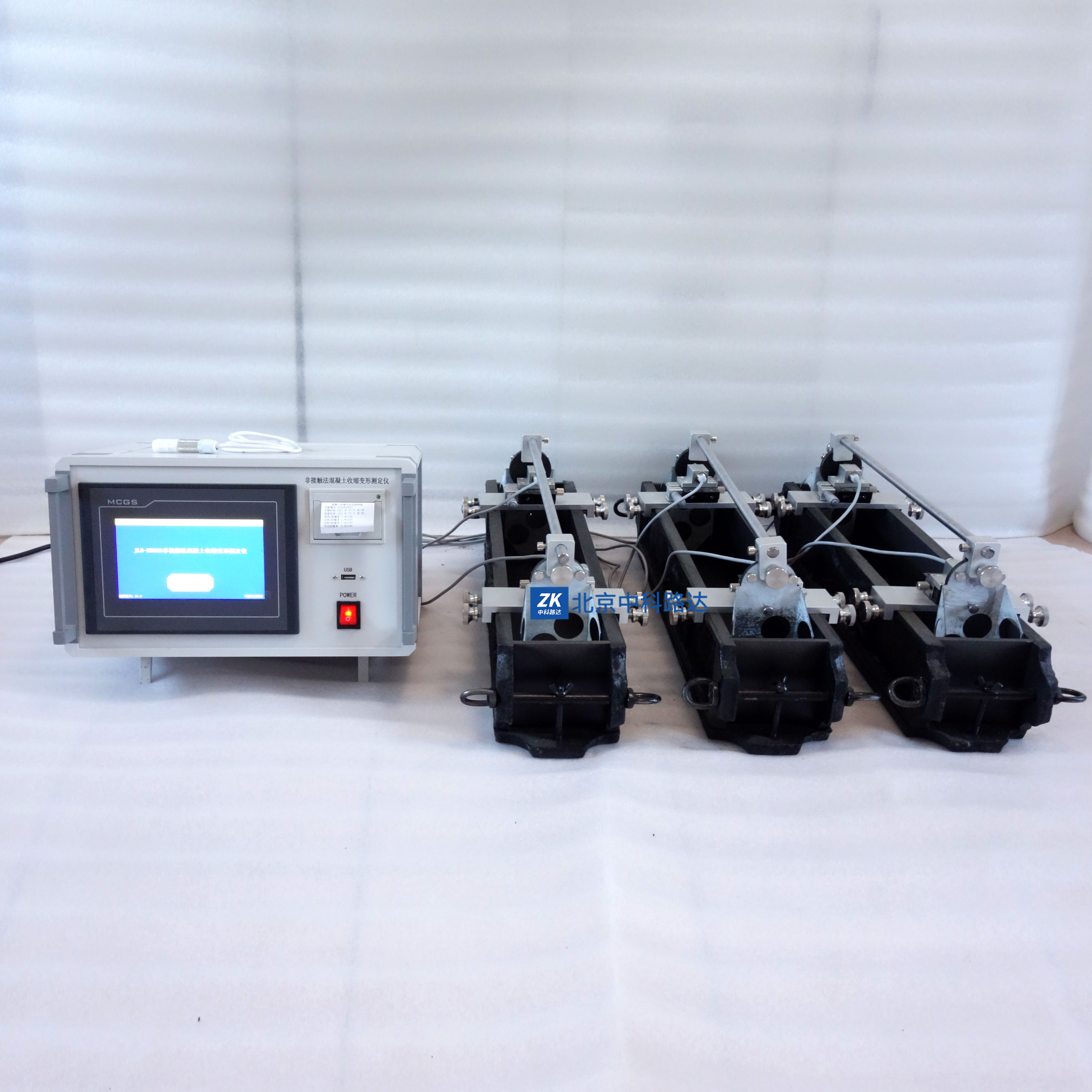 本儀器依據GB/T 50082-2008《普通混凝土長期性能和耐久性能試驗方法標準》所規定的非接觸法混凝土收縮試驗方法生產,適用于測定自成型后任意時段的自由收縮變形,也可用于無約束狀態下混凝土早齡期與外界隔絕濕交換的條件下自收縮變形的測定。儀器由測定儀主機、非接觸式位移傳感器探頭、位移傳感器探頭調節固定裝置和專用混凝土收縮變形測定儀數據處理軟件等組成。該產品結構合理,觸屏控制、自動化程度高,記錄時間準確,性能穩定操作方便,數據可儲存于觸摸屏內,并可調閱歷史數據。
