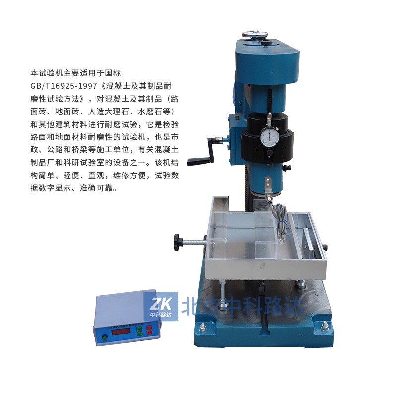 本試驗(yàn)機(jī)主要適用于國標(biāo)GB/T16925-1997《濕凝土及其制品耐磨性試驗(yàn)方法》,對混凝土及其制品(路面磚、地面磚、人造大理石、水磨石等)和其他建筑材料進(jìn)行耐磨試驗(yàn),它是檢驗(yàn)路面和地面材料耐磨性的試驗(yàn)機(jī),也是市政、公路和橋梁等施工單位,有關(guān)混凝土制品廠和科研試驗(yàn)室的設(shè)備之一。該機(jī)結(jié)構(gòu)簡單、輕便、直觀,維修方便,試驗(yàn)數(shù)據(jù)數(shù)字顯示、準(zhǔn)確可靠。