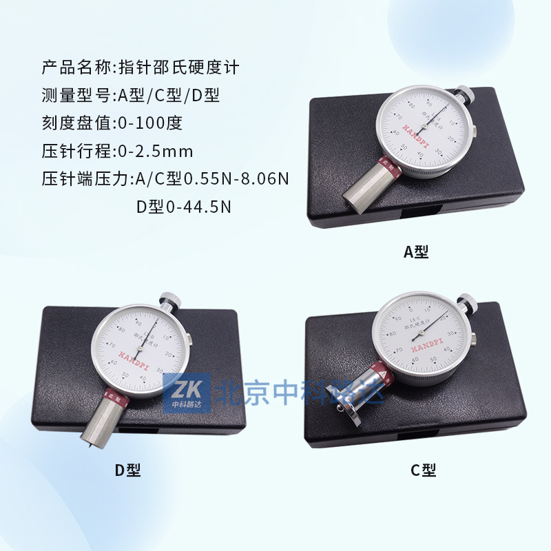 邵氏橡膠硬度計是測定硫化橡膠和塑料制品硬度的儀器,該儀器有A型、D型、C型三種形式。