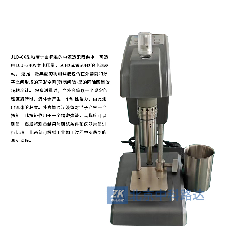 JLD-06型粘度計由標準的電源適配器供電,可適用100~240V寬電壓帶,50Hz或者60Hz的電源驅動。 這是一款典型的將測試液包含在外套筒和浮子之間形成的環形空間(剪切間隙)里的同軸圓筒旋轉粘度計。 粘度測量時,當外套筒以一個設定的速度旋轉時,流體會產生一個粘性阻力,由此測出流體的粘度。外套筒通過液體對浮子產生一個扭矩,此扭矩作用于一個精密彈簧,其撓度可以測量,然后將測量結果與測試條件和儀器常量進行比較。此系統可模擬工業加工過程中所遇到的真實流程。