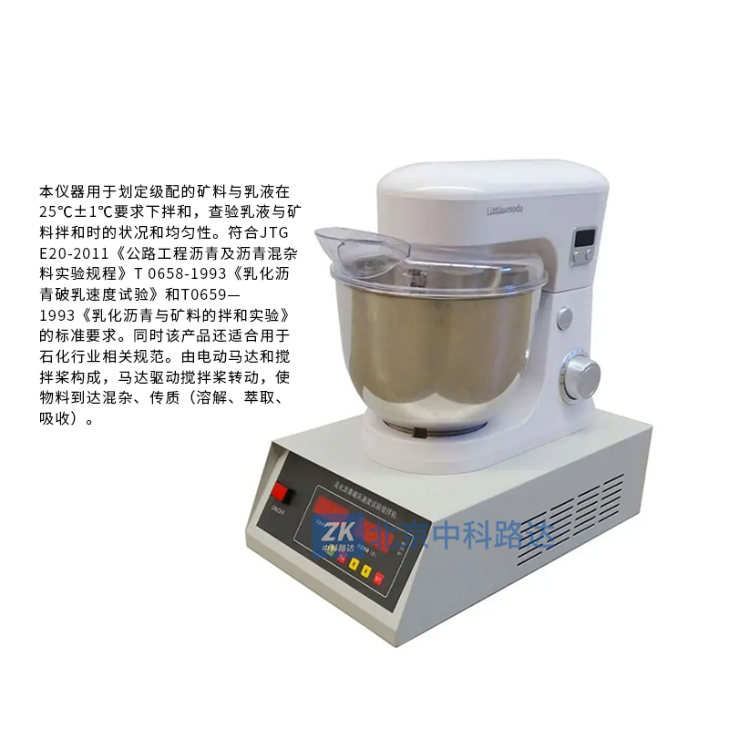 SYD-0658 乳化瀝青破乳速度攪拌機一、產(chǎn)品介紹:本儀器用于劃定級配的礦料與乳液在 25℃±1℃要求下拌和,查驗乳液與礦料拌和時的狀況和均勻性。符合JTG E20-2011《公路工程瀝青及瀝青混雜料實驗規(guī)程》T 0658-1993《乳化瀝青破乳速度試驗》和T0659—1993《乳化瀝青與礦料的拌和實驗》的標準要求。同時該產(chǎn)品還適合用于石化行業(yè)相關(guān)規(guī)范。由電動馬達和攪拌槳構(gòu)成,馬達驅(qū)動攪拌槳轉(zhuǎn)動,使物料到達混雜、傳質(zhì)(溶解、萃取、吸收)。