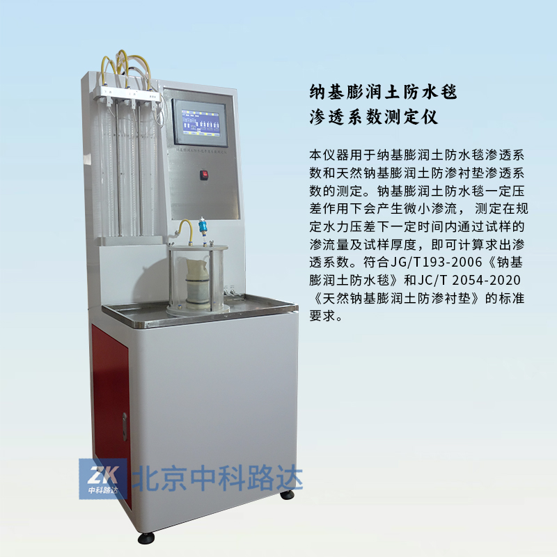 本儀器用于納基膨潤土防水毯滲透系數和天然鈉基膨潤土防滲襯墊滲透系數的測定。鈉基膨潤土防水毯一定壓差作用下會產生微小滲流, 測定在規定水力壓差下一定時間內通過試樣的滲流量及試樣厚度,即可計算求出滲透系數。符合JG/T193-2006《鈉基膨潤土防水毯》和JC/T 2054-2020《天然鈉基膨潤土防滲襯墊》的標準要求。