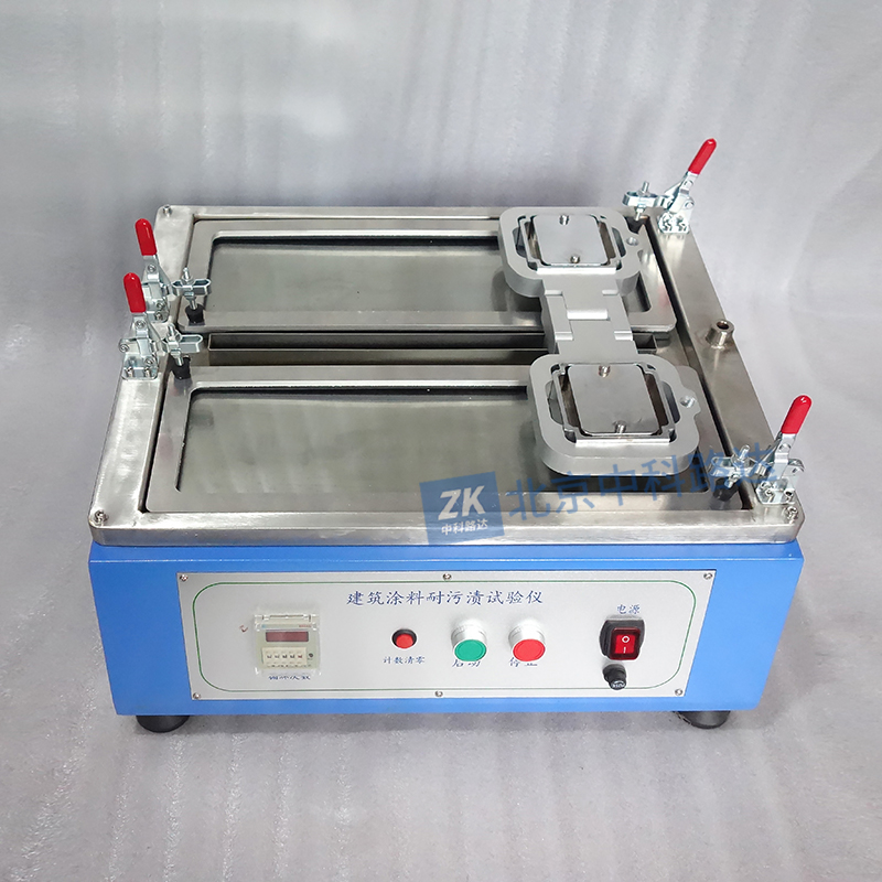 耐污漬試驗儀用于實驗室評價內墻涂料的耐污漬性能。不同的涂料干膜表面在受到污染后,污漬從干膜表面去除的難易程度不同,這種難易程度反映了干膜表面的耐污漬能力,即耐污漬性。目前使用較多的測試方法是基于ASTM D4828和GB/T9780-2013標準,將涂膜刮在黑色塑料片上在標準狀態下養護7天,測試干膜的反射系數后再在干膜上涂布污漬,一定時間后在耐污漬試驗機上擦洗一定次數,然后沖洗晾干涂膜,測試擦洗區域的反射系數。通過對比前后二次的反射系數來評價涂膜的耐污漬性能。本機為雙磨頭組件配置。