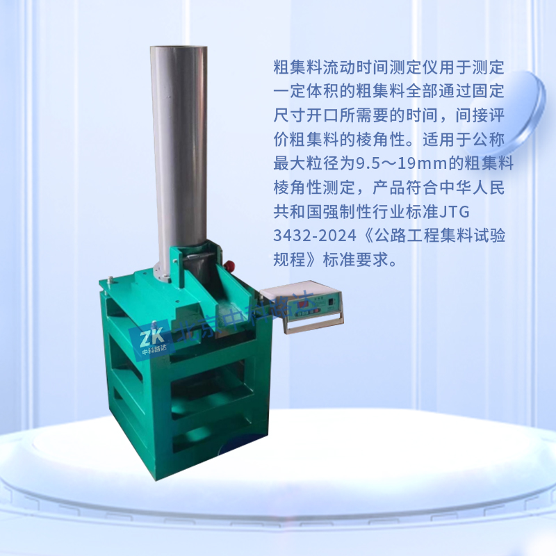 粗集料流動時間測定儀用于測定一定體積的粗集料全部通過固定尺寸開口所需要的時間,間接評價粗集料的棱角性。適用于公稱最大粒徑為9.5~19mm的粗集料棱角性測定,產品符合中華人民共和國強制性行業(yè)標準JTG 3432-2024《公路工程集料試驗規(guī)程》標準要求。