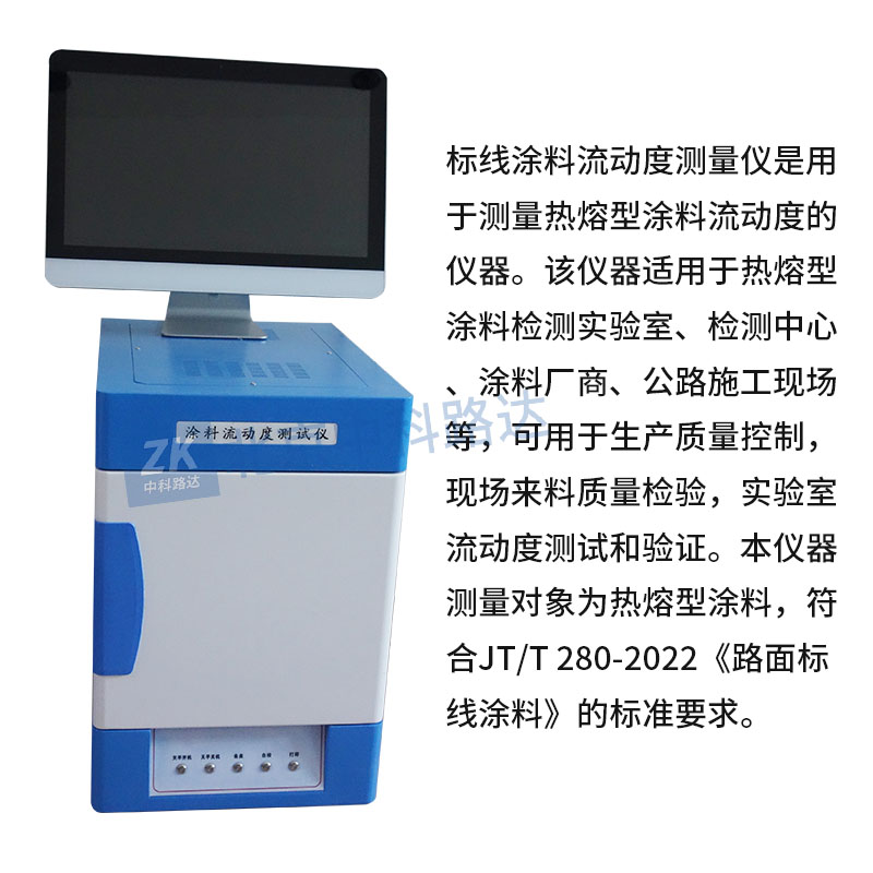 標線涂料流動度測量儀是用于測量熱熔型涂料流動度的儀器。該儀器適用于熱熔型涂料檢測實驗室、檢測中心、涂料廠商、公路施工現場等,可用于生產質量控制,現場來料質量檢驗,實驗室流動度測試和驗證。本儀器測量對象為熱熔型涂料,符合JT/T 280-2022《路面標線涂料》的標準要求。
