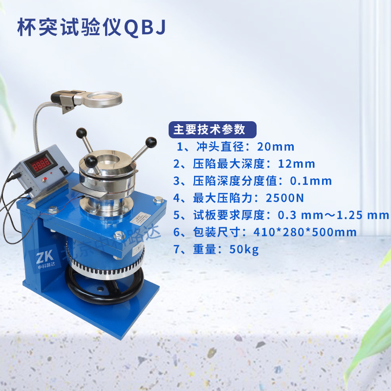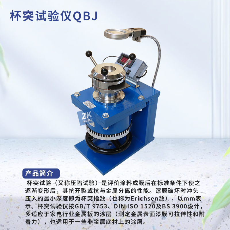 杯突試驗(又稱壓陷試驗)是評價涂料成膜后在標準條件下使之逐漸變形后,其抗開裂或抗與金屬分離的性能。漆膜破壞時沖頭壓入的最小深度即為杯突指數(shù)(也稱為Erichsen數(shù)),以mm表示。杯突試驗儀按GB/T 9753、DIN ISO 1520及BS 3900設計,多適應于家電行業(yè)金屬板的涂層(測定金屬表面漆膜可拉伸性和附著力),也適用于一些非金屬底材上的涂層。