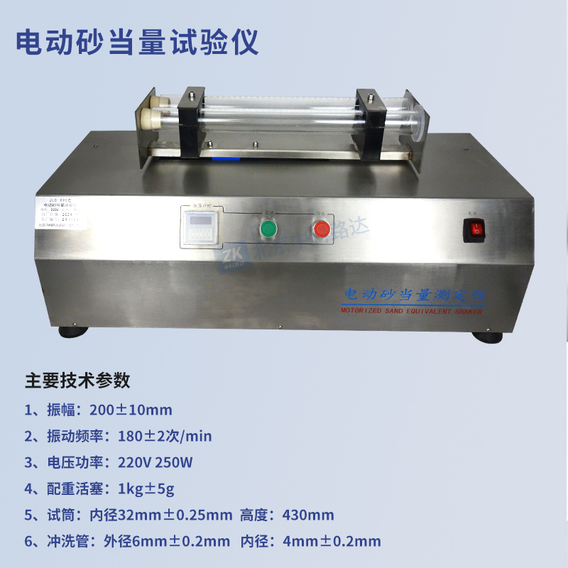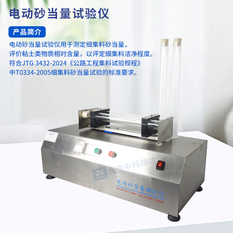 電動砂當量試驗儀用于測定細集料砂當量,評價粘土類物質相對含量,以評定細集料潔凈程度。符合JTG 3432-2024《公路工程集料試驗規程》中T0334-2005細集料砂當量試驗的標準要求。