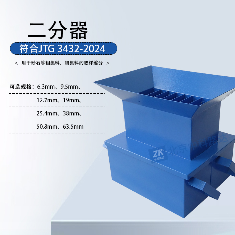 分料器為槽格式二分器。有偶數個等寬的槽格,每個分料器配備2個接料斗,可用于砂石等粗集料,細集料的取樣縮分。符合JTG 3432-2024《公路工程集料試驗規程》標準要求。也用于煤、礦樣或其它不均勻粒狀物料的縮分取樣。
