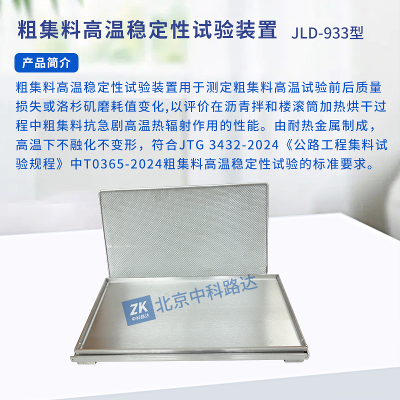 粗集料高溫穩定性試驗裝置用于測定粗集料高溫試驗前后質量損失或洛杉磯磨耗值變化,以評價在瀝青拌和樓滾筒加熱烘干過程中粗集料抗急劇高溫熱輻射作用的性能。由耐熱金屬制成,高溫下不融化不變形,符合JTG 3432-2024《公路工程集料試驗規程》中T0365-2024粗集料高溫穩定性試驗的標準要求。...