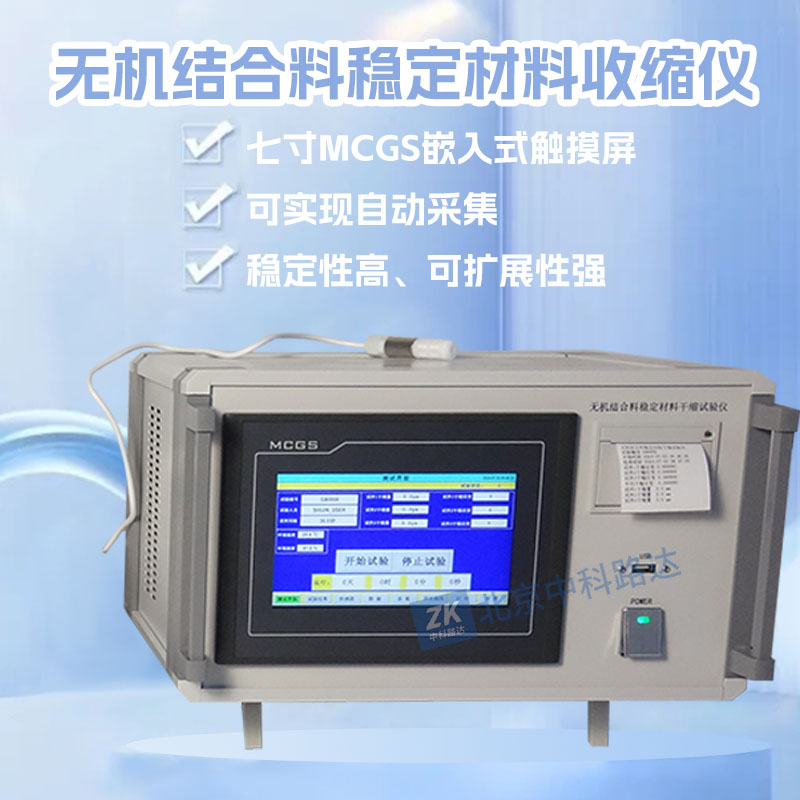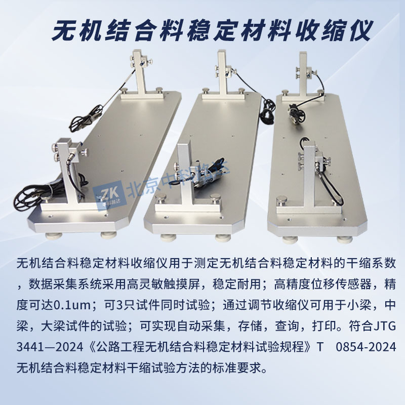無機結合料穩定材料收縮儀用于測定無機結合料穩定材料的干縮系數,數據采集系統采用高靈敏觸摸屏,穩定耐用;高精度位移傳感器,精度可達0.1um;可3只試件同時試驗;通過調節收縮儀可用于小梁,中梁,大梁試件的試驗;可實現自動采集,存儲,查詢,打印。符合JTG 3441—2024《公路工程無機結合料穩定材料試驗規程》T 0854-2024無機結合料穩定材料干縮試驗方法的標準要求。
