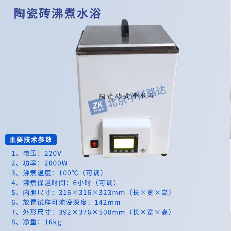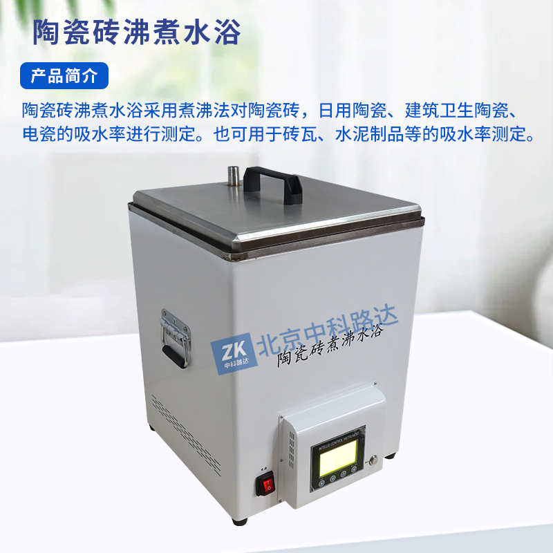陶瓷磚沸煮水浴采用煮沸法對陶瓷磚,日用陶瓷、建筑衛(wèi)生陶瓷、電瓷的吸水率進(jìn)行測定。也可用于磚瓦、水泥制品等的吸水率測定。主控芯片采用微處理器,全過程自動(dòng)化控制,也可以手動(dòng)設(shè)置操作,操作簡單。主機(jī)采用不銹鋼內(nèi)膽及優(yōu)質(zhì)保溫棉制造,具有水位設(shè)置,自動(dòng)補(bǔ)水,持續(xù)煮沸,防止干燒等功能,并可任意設(shè)置溫度,恒溫時(shí)間,水位高度。滿足GB/T 3810.3-2016《陶瓷磚試驗(yàn)方法第3部分 :吸水率、顯氣孔率、表觀相對密度和容重的測定》、GB/T 3299-2011《日用陶瓷器吸水率測定方法》等標(biāo)準(zhǔn)要求。