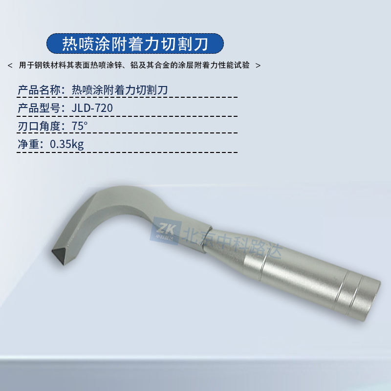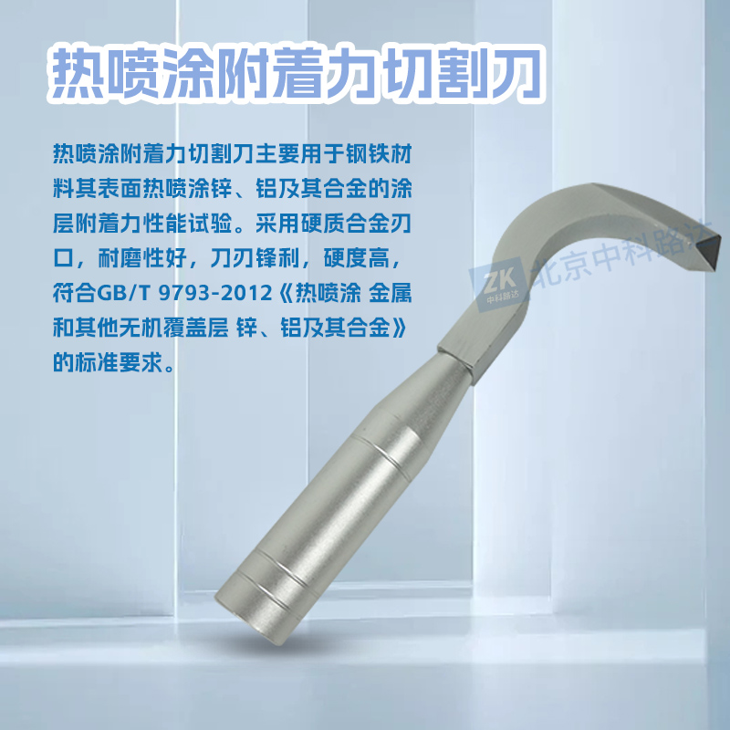熱噴涂附著力切割刀主要用于鋼鐵材料其表面熱噴涂鋅、鋁及其合金的涂層附著力性能試驗。采用硬質合金刃口,耐磨性好,刀刃鋒利,硬度高,符合GB/T 9793-2012《熱噴涂 金屬和其他無機覆蓋層 鋅、鋁及其合金》的標準要求。