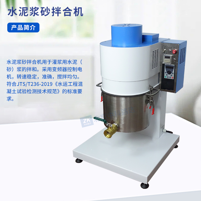 水泥漿砂拌合機用于灌漿用水泥(砂)漿的拌和。采用變頻器控制電機,轉速穩定,準確,攪拌均勻。符合JTS/T236-2019《水運工程混凝土試驗檢測技術規范》的標準要求。